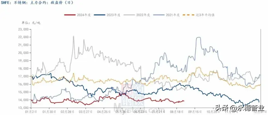 从数据图中可以看出,近三年佛山304冷轧宏旺9月份现货价格都不同,21、22年呈现震荡上行态势,但23年呈现下滑走势。