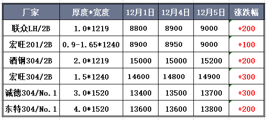 304市场价格方面,也孕育出上涨的机会。由于当前市场售价较低,一些规格甚至触及商家成本线,导致一些贸易商订货谨慎。在成本及市场现货库存偏紧的情况下,市场商家有惜售情绪,价格普遍调涨200-300/吨。